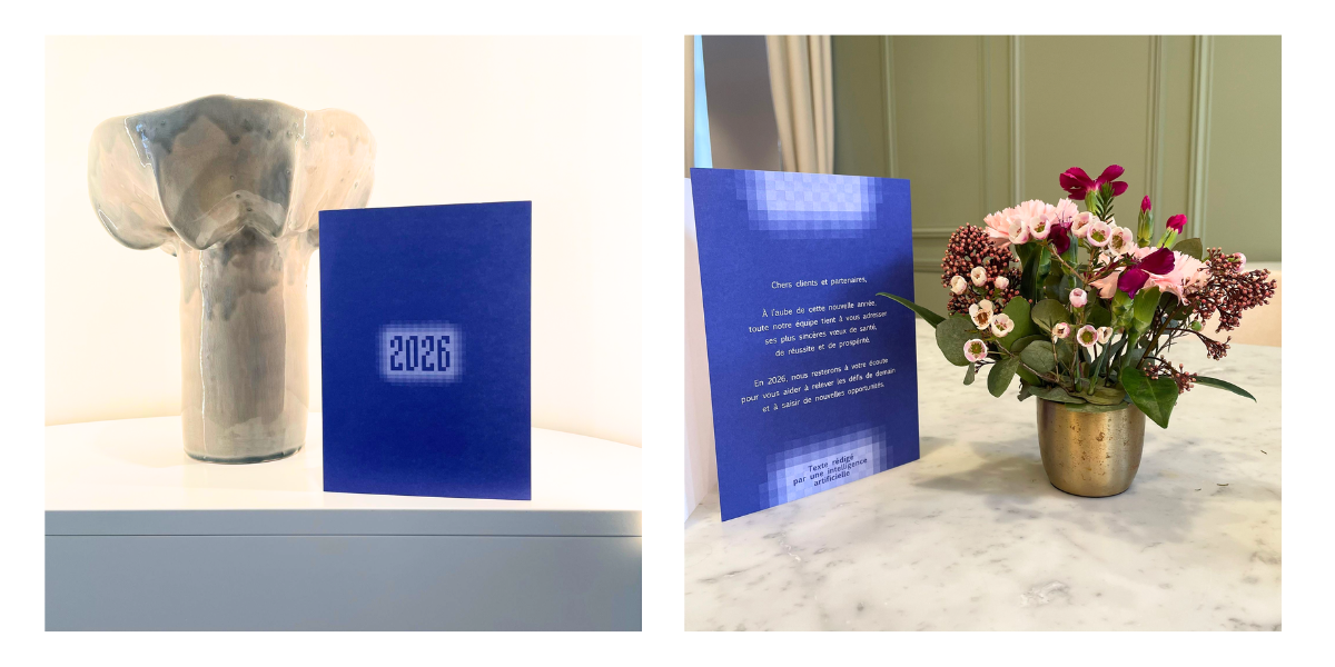 Pour cette carte de vœux, nous avons fait dialoguer deux écritures : un mot généré par l’intelligence artificielle, prolongé par notre écriture manuscrite. Une manière simple et sincère de rappeler que, si les outils évoluent et ouvrent de nouvelles perspectives, la sensibilité, l’intuition et la relation humaine demeurent au cœur de toute création.